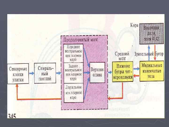 СЛУХОВОЙ АНАЛИЗАТОР, ХАРАКТЕРИСТИКА ОТДЕЛОВ. 1. 2. Периферический отдел – чувствительные волосковые клетки кортиева органа, расположенного во внутреннем ухе. Проводниковый отдел. От спирального ганглия улитки кохлеарный нерв (в составе VIII пары черепно-мозговых нервов) продолговатый мозг (нейроны кохлеарных ядер) слуховой тракт нейроны верхней оливы нижние бугры четверохолмия среднего мозга внутренние (медиальные) коленчатые тела. 3. Центральный отдел – височная доля коры больших полушарий.