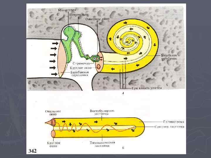 Теория «бегущей волны» Бекеши (1960 -1966 гг. ). Звуковые колебания высокой частоты вовлекают в колебательный процесс перелимфу на ограниченном участке вблизи овального окна и передаются эндолимфе на коротком участке. При более низких звуках max колебаний возникает в средней части улитки.