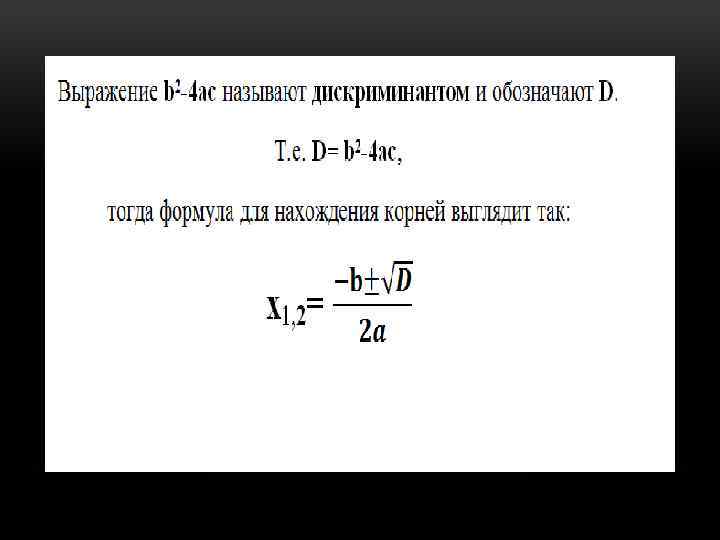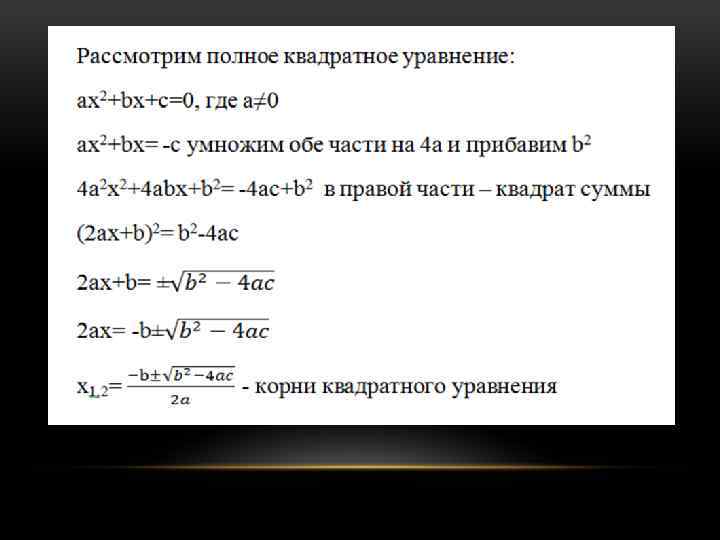 ДЕЛАЕМ ВЫВОД: • D>0 • D=0 • D<0 2 корня, 1 корень (или равные, совпадающие кратности 2). Такое уравнение удобнее решать используя формулу полного квадрата. Действительных корней нет.