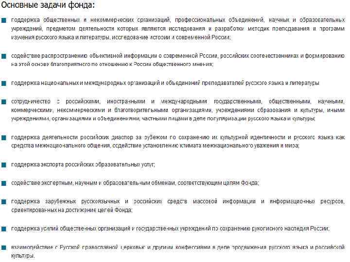 Состав попечительского совета с 13 января 2010 года Указом Президента Российской Федерации от 13 января 2010 года № 64 утверждён следующий состав попечительского совета фонда: Председатель: Вербицкая Л. А. — президент Международной ассоциации преподавателей русского языка и литературы, президент федерального государственного образовательного учреждения высшего профессионального образования «Санкт-Петербургский государственный университет» . Члены попечительского совета: Богданов С. И. — Председатель наблюдательного совета Российского общества преподавателей русского языка и литературы, проректор федерального государственного образовательного учреждения высшего профессионального образования «Санкт-Петербургский государственный университет» Винокуров С. Ю. — начальник Управления Президента Российской Федерации по межрегиональным и культурным связям с зарубежными странами Дзасохов А. С. — заместитель председателя Комиссии Российской Федерации по делам ЮНЕСКО Добродеев О. Б. — генеральный директор ВГТРК Игнатенко В. Н. — генеральный директор ИТАР-ТАСС