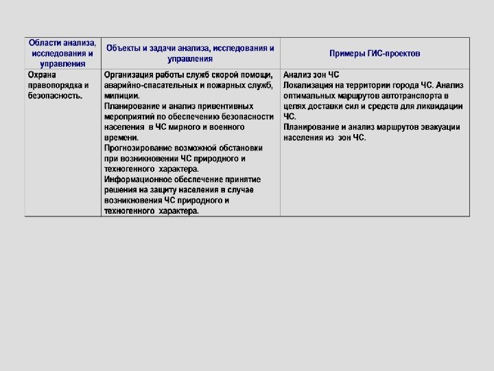 Проектирование городов Реагирование на стихийные бедствия Изучение потребностей рынка Образование Военная область Землепользование Производство карт ГИС Борьба с преступностью Размещение предприятий Защита окружающей среды