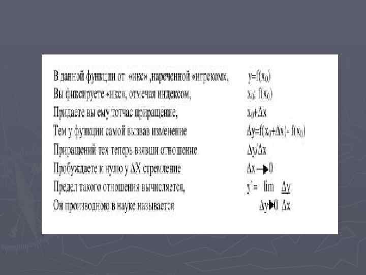 ► Независимо друг от друга И. Ньютон и Г. Лейбниц разработали аппарат дифференциального исчисления, которым мы и пользуемся в настоящее время. И. Ньютон в основном опирался на физические представления о мгновенной скорости движения, считая его очевидным и сводя к нему другие случаи производной.