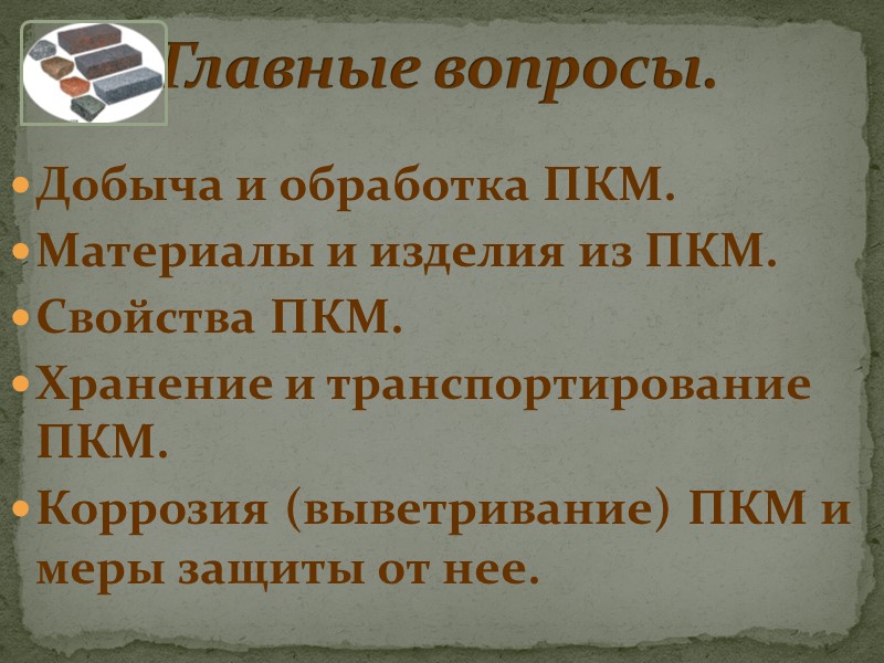 Добыча и обработка ПКМ. Материалы и изделия из ПКМ. Свойства ПКМ. Хранение и транспортирование ПКМ. Коррозия (выветривание) ПКМ и меры защиты от нее. Главные вопросы.