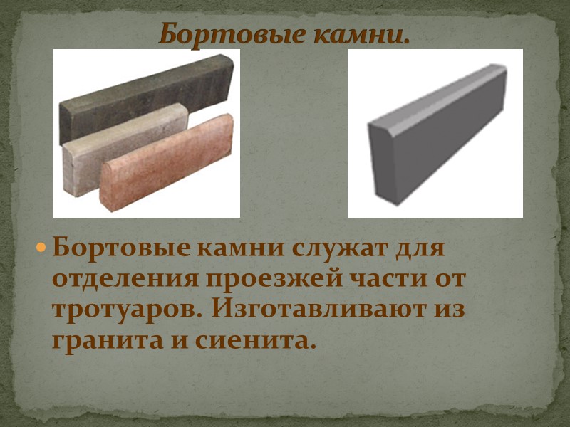 Бортовые камни служат для отделения проезжей части от тротуаров. Изготавливают из гранита и сиенита. Бортовые камни.