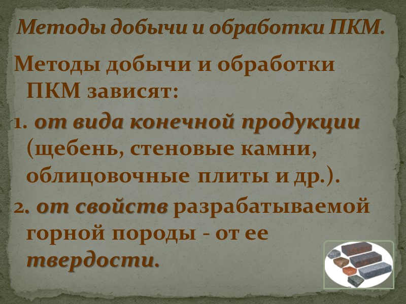 Методы добычи и обработки ПКМ зависят: 1. от вида конечной продукции (щебень, стеновые камни, облицовочные плиты и др.). 2. от свойств разрабатываемой горной породы - от ее твердости. Методы добычи и обработки ПКМ.