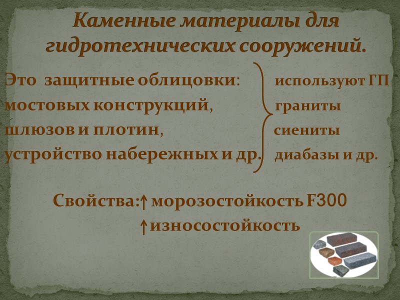 Каменные материалы для гидротехнических сооружений. Это защитные облицовки: используют ГП мостовых конструкций, граниты шлюзов и плотин, сиениты устройство набережных и др. диабазы и др. Свойства: морозостойкость F300 износостойкость