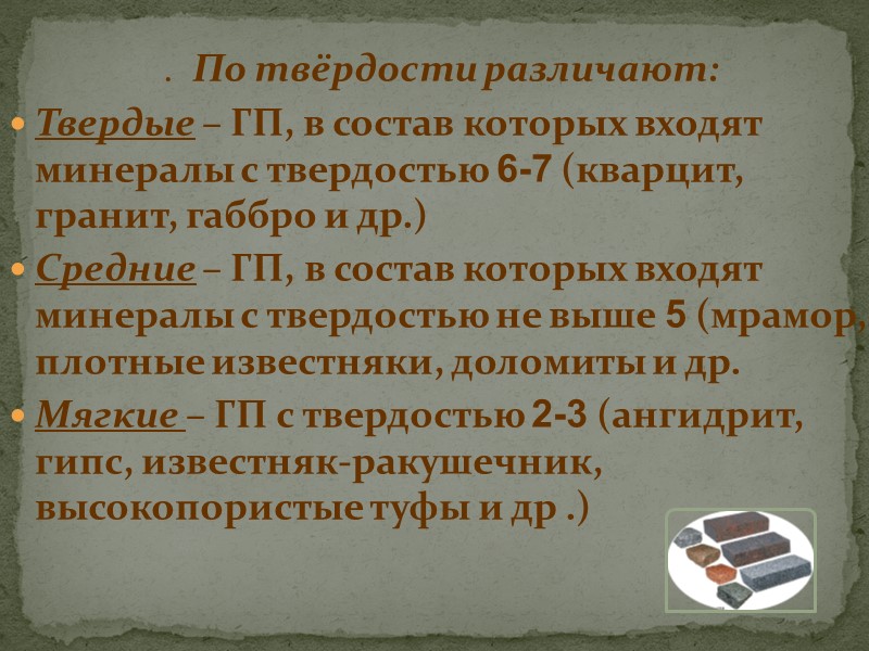 . По твёрдости различают: Твердые – ГП, в состав которых входят минералы с твердостью 6-7 (кварцит, гранит, габбро и др.) Средние – ГП, в состав которых входят минералы с твердостью не выше 5 (мрамор, плотные известняки, доломиты и др. Мягкие – ГП с твердостью 2-3 (ангидрит, гипс, известняк-ракушечник, высокопористые туфы и др .)