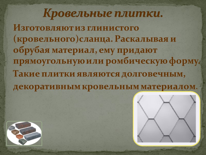 Изготовляют из глинистого (кровельного)сланца. Раскалывая и обрубая материал, ему придают прямоугольную или ромбическую форму. Такие плитки являются долговечным, декоративным кровельным материалом. Кровельные плитки.
