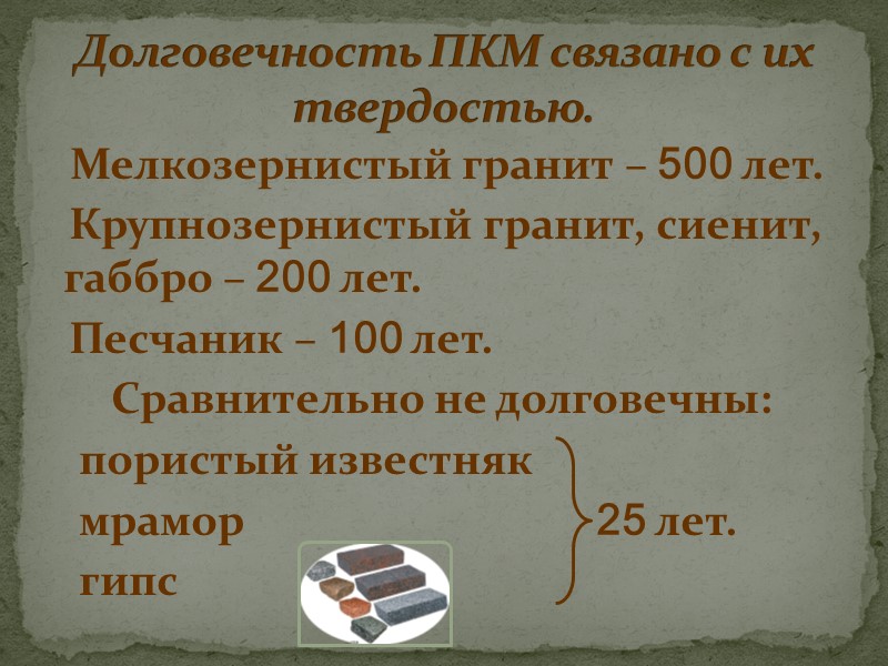 Мелкозернистый гранит – 500 лет. Крупнозернистый гранит, сиенит, габбро – 200 лет. Песчаник – 100 лет. Сравнительно не долговечны: пористый известняк мрамор 25 лет. гипс Долговечность ПКМ связано с их твердостью.