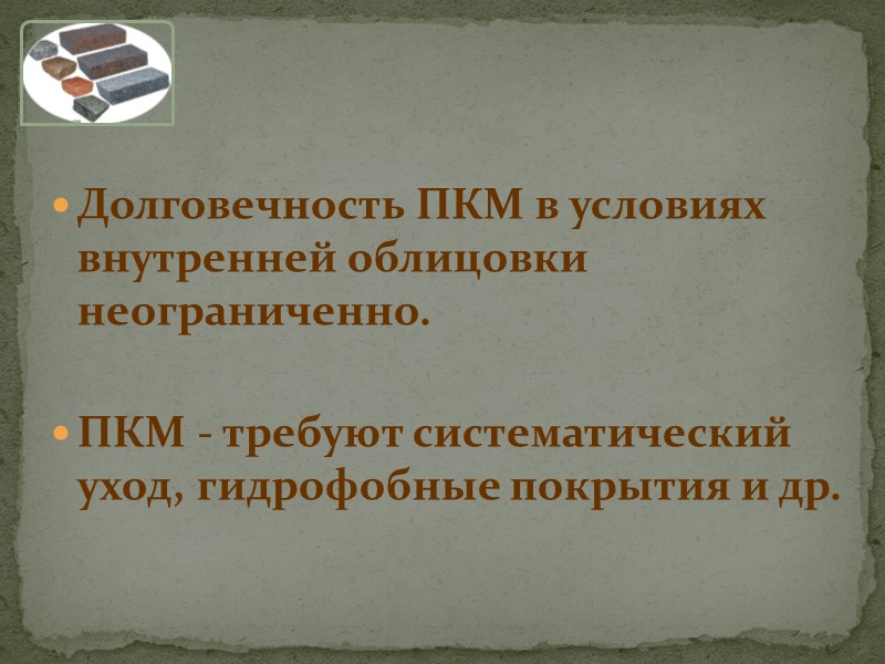 Долговечность ПКМ в условиях внутренней облицовки неограниченно. ПКМ - требуют систематический уход, гидрофобные покрытия и др.