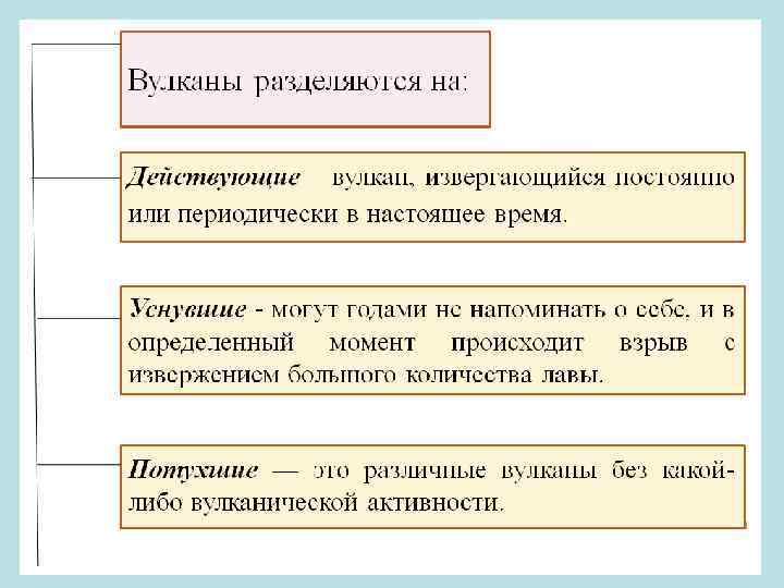 Основные части вулканического аппарата: • магматический очаг (в земной коре или верхней мантии); • жерло – выводной канал, по которому магма поднимается к поверхности Земли; • конус – возвышенность на поверхности Земли, состоящая из продуктов выброса вулкана; • кратер – углубление на поверхности конуса вулкана.