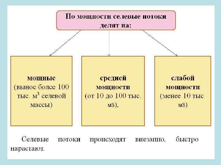 Сели − грязекаменные потоки, характерные для горной местности. Это смесь воды, грязи, камней, деревьев и других предметов. Объем перемещаемой породы – миллионы кубических метров. Длительность селевых потоков достигает 10 часов при высоте волны до 15 м. Причины: землетрясения, обильные снегопады, ливни, интенсивное таяние снега. Основная опасность − огромная кинетическая энергия грязекаменных потоков, скорость движения которых может достигать 15 км/час.