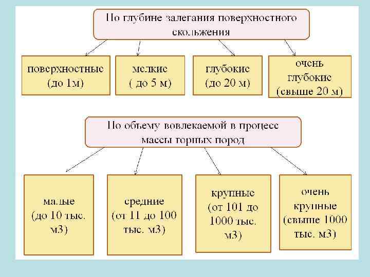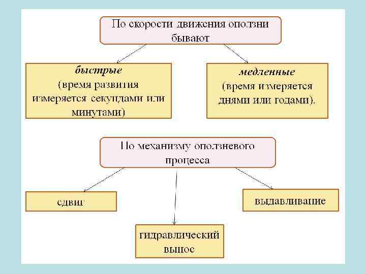 Оползень − скользящее смещение масс грунта вниз по склону под действием силы тяжести. Масса породы начинает движение, когда силы сцепления на поверхности скольжения становятся меньше составляющей силы тяжести.