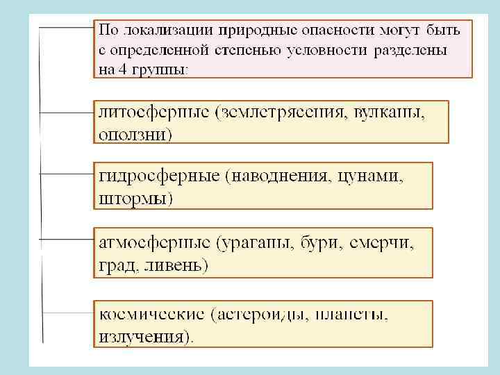 К природным опасностям относятся стихийные явления, которые представляют непосредственную угрозу для жизни и здоровья людей. Говоря о природных опасностях, следует подчеркнуть роль антропогенного влияния на их проявление. Известны многочисленные факты нарушения равновесия в природной среде в результате деятельности человечества, приводящие к усилению опасных воздействий. Между природными опасностями существует взаимная связь. Одно явление может послужить причиной, спусковым механизмом последующих явлений.