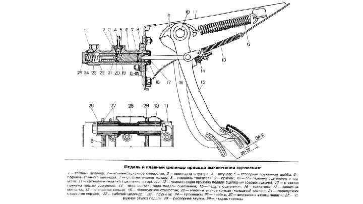 Перед прокачкой гидропривода сцепления проверяют уровень жидкости в бачке; при необходимости жидкость доливают. Надевают на головку штуцера 9 рабочего цилиндра шланг, нижний конец которого погружают в сосуд с жидкостью, применяемой для гидропривода. Резко нажимают 3 -5 раз на педаль сцепления с интервалами 2 -3 с и, удерживая педаль в нажатом положении, отвертывают на 1/2 -3/4 оборота штуцер 9, вытесняя нажатием на педаль находящуюся в приводе жидкость вместе с воздухом через шланг в сосуд. После того как педаль достигнет крайнего переднего положения и истечение жидкости через шланг прекратится, заворачивают штуцер до отказа. Затем повторяют указанную операцию до полного выхода пузырьков воздуха и, удерживая педаль нажатой, заворачивают штуцер до отказа, снимают шланг и надевают колпачок штуцера.