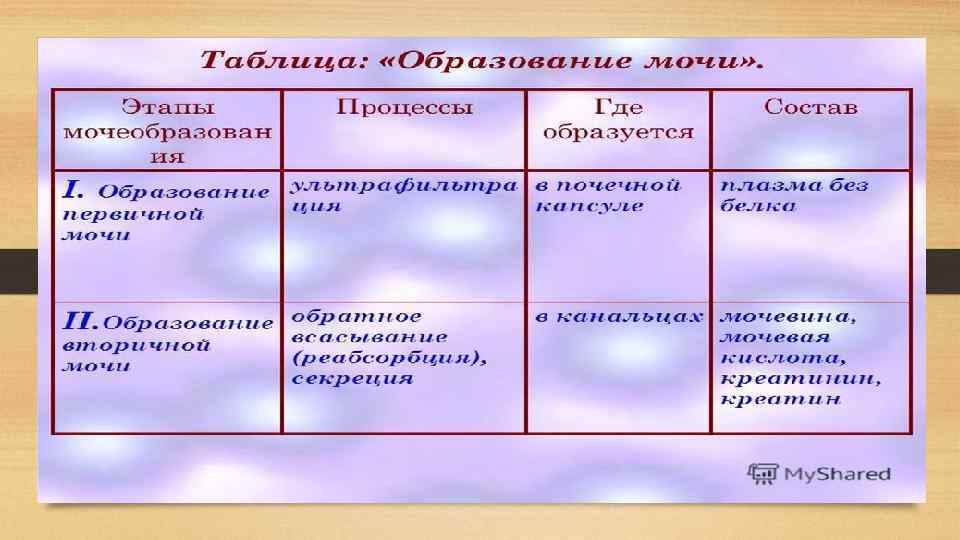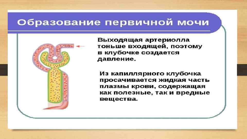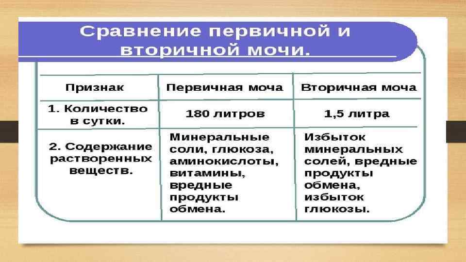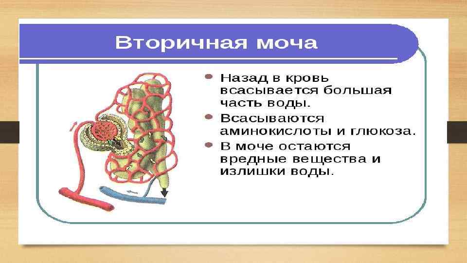 Вторичная моча • Вторичная моча образуется в так называемой петле Генле и извитых канальцах. При прохождении по ним из первичной мочи обратно в кровь всасывается до 99 % воды, а также все аминокислоты, сахара и некоторые минеральные соли. • По составу вторичная моча значительно отличается от первичной. В ней нет аминокислот и глюкозы, понижена концентрация многих минеральных солей, но повышена концентрация мочевины, мочевой кислоты, а также сульфатов и фосфатов. По собирательным трубочкам вторичная моча собирается в почечную лоханку, а из нее попадает в мочеточник.