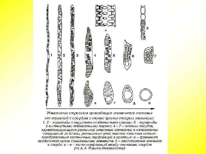 4. Проводящие ткани Обеспечивают транспорт веществ в растении. Это сложное образование, состоящее из проводящих элементов и сопутствующих им механических и основных тканей. 1. Ксилема (древесина). Состоит из сосудов (трахей) и трахеид, осуществляющих восходящий ток воды и минеральных веществ, а также древесных волокон и древесной паренхимы. Сосуды – длинные микроскопические трубки. Торцевые стенки клеток, образовавших сосуды почти полностью растворяются и возникают сквозные отверстия (перфорации). Это более совершенная проводящая ткань, достигающая наибольшего развития у покрытосеменных.