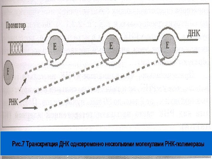 n n Обычно на каждом транскрибируемом гене работают , двигаясь друг за другом несколько молекул РНК – полимераз конвеерным способом. Расстояние между ними в среднем 300 -500 н. п. Соответственно одним геном одновременно связано несколько растущих цепей пре-РНК.