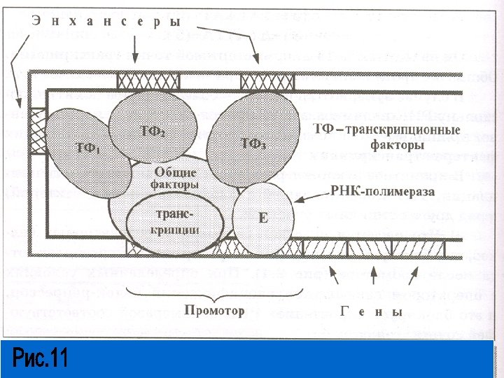 n n n . Для активации транскрипции необходимо участие также специфических факторов транскрипции – энхансеров. Энхансеры располагаются достаточно далеко от регулируемого гена, на расстоянии нескольких тысяч нуклеотидных пар.