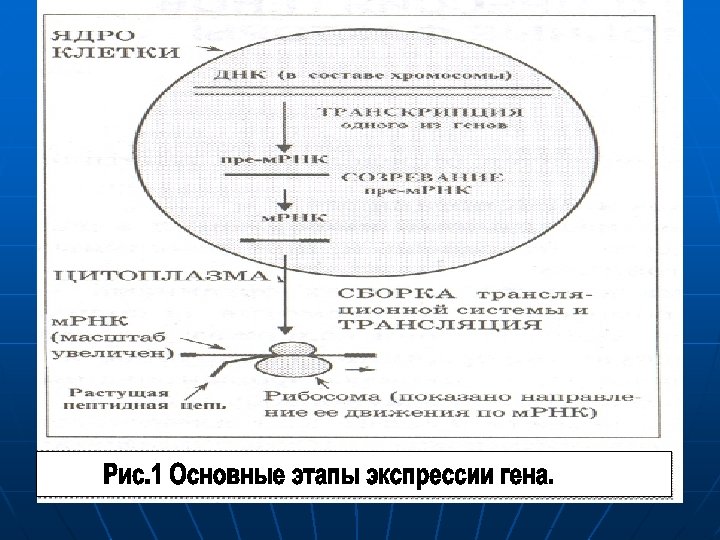 Транскрипция n n Реализация генетической информации о структуре определенного белка включает два этапа: транскрипцию и трансляцию. Транскрипция - это первый этап реализации генетической информации, при котором в клетках осуществляется биосинтез РНК на матрице ДНК, т. е. переписывание информации о структуре белка с ДНК на специальный посредник – м РНК.