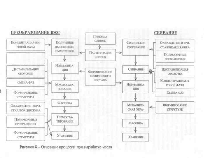 Процессы при выработке масла 1) концентрирование жира; 2) охлаждение жира, фазовые превращения (кристаллизация, частичное отвердевание, полиморфные переходы, частичная дестабилизация жировой фазы); 3) нарушение оболочек (массовая дестабилизация 4) смена фаз; 5) формирование структуры; 6) формирование состава.