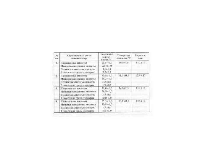 • Сезонные колебания содержания насыщенных и ненасыщенных жирных кислот существенно изменяют его физические свойства. • Молочный жир зимнего периода в сравнении с летним отличается повышенной твердостью и температурой плавления. • Данная зависимость в определенной степени обусловлена свойствами жирных кислот входящих в состав глицеридов молочного жира