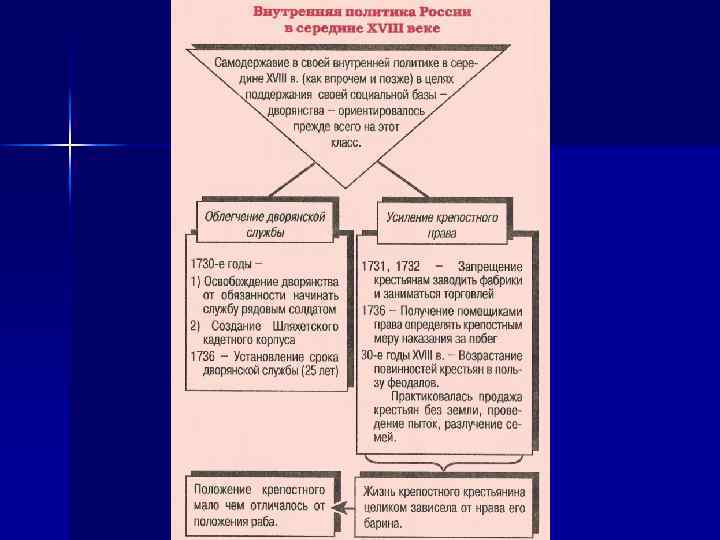 ОСНОВНЫЕ ПРИЧИНЫ «ДВОРЦОВЫХ ПЕРЕВОРОТОВ» Указ 1722 г. Петра 1 о праве монарха назначать себе преемника по своему разумению: • Прерван естественный для России принцип престолонаследования по старшинству в царствующей фамилии. • Свержение верховной власти не выглядело теперь как покушение на святость. • Увеличение числа претендентов на трон, усиление борьбы соперничающих группировок за власть. Усиление роли гвардии в государственных делах, ставшей опорой и движущей силой дворцовых переворотов.