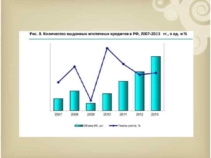 Год Объем выданных ипотечных кредитов млрд. руб. Количество выданных ипотечных кредитов, тыс. шт. Средняя процентная ставка по ипотечным кредитам, % Просроченная задолженность по ипотечным кредитам, млн. руб. 2007 564, 6 214 12, 6 1 335 2008 655, 8 350 12, 9 20 261 2009 152, 5 130 14, 6 96 220 2010 380, 1 301 13, 1 156 154 2011 713, 0 521 12 174 211 2012 1100, 0 622 12, 2 176 337 2013 1200, 0 800 12, 5 174 211