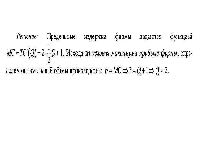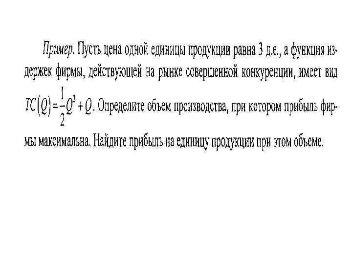 Проверьте себя: Функция общих издержек фирмы, действующей в условиях совершенной конкуренции: TC=(TP)3 -2(TP)2+10 TP+300 (где TP – общий выпуск фирмы) • По какой минимальной цене фирма будет готова продавать продукцию в краткосрочном периоде? • Запишите функцию предложения фирмы в краткосрочном периоде