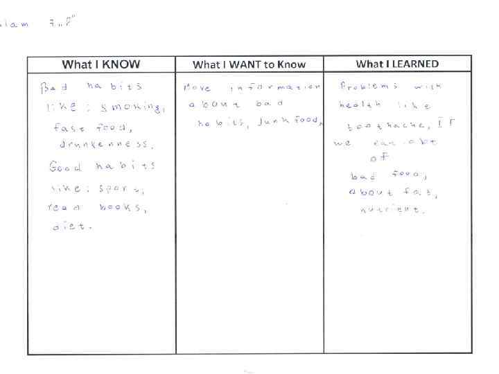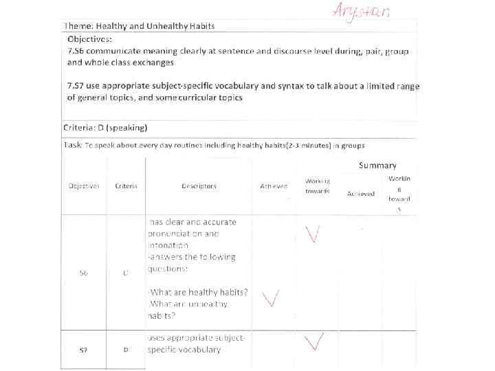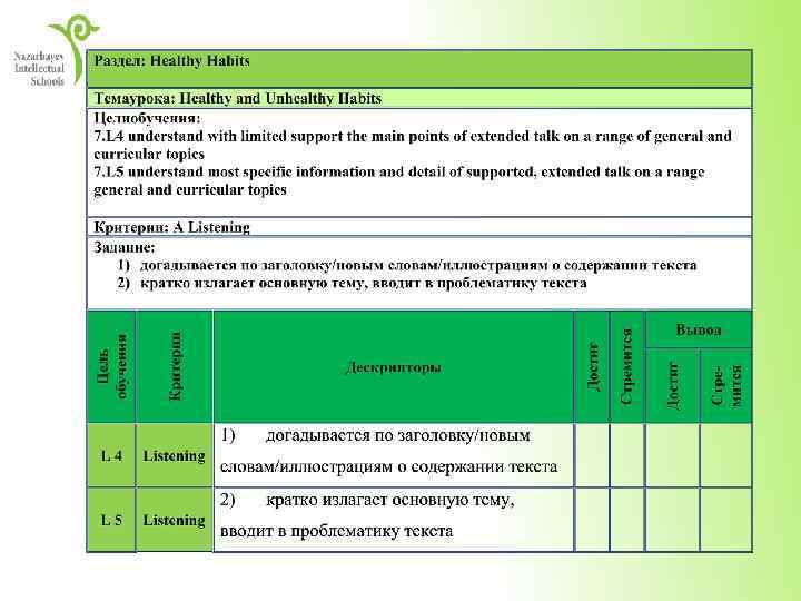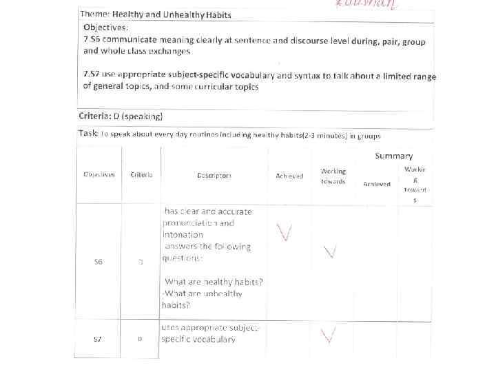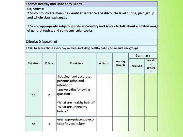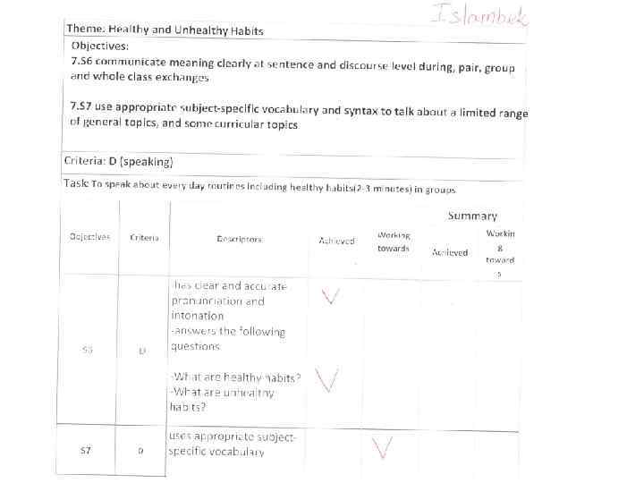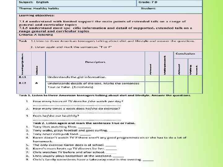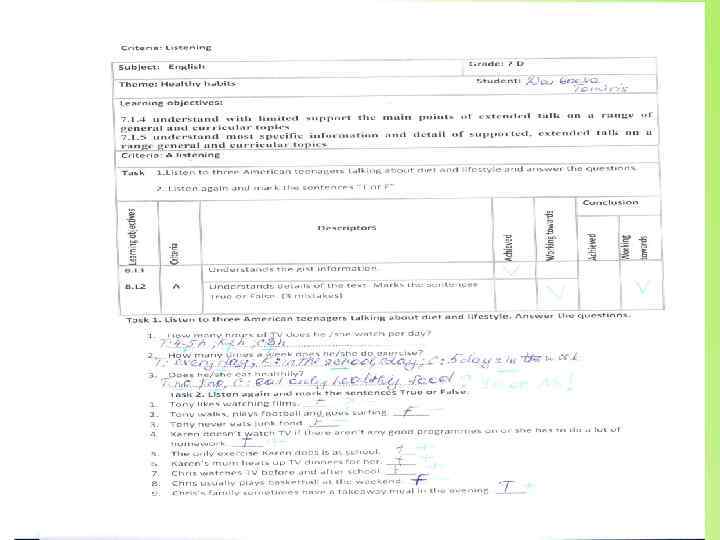 2. While – listening (во время прослушивания) Subject: English Grade: 7 D Theme: Healthy and Unhealthy Habits Name: Learning objectives: 7. L 4 understand with limited support the main points of extended talk on a range of general and curricular topics 7. L 5 understand most specific information and detail of supported, extended talk on a range general and curricular topics Criteria: A Listening Task: Прослушать текст и определить основную мысль Вставить пропущенные слова идею 2 выделяет специфическую и детальную понимает основную прослушанного материала A 7. L 5 Working towards информацию Working towards Conclusion Achieved Descriptors 1 7. L 4 Achieved Criteria Learning objectives: