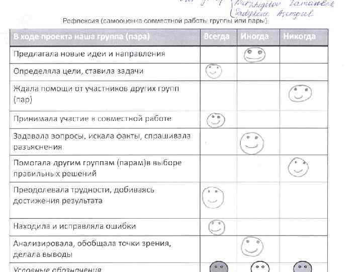Рефлексия (“Felt-Tip-Pens”) В ходе проекта группа (пара) Предлагала новые идеи и направления Определяла цели, ставила задачи Ждала помощи от участников других групп (пар) Принимала участие в совместной работе Задавала вопросы, искала факты, спрашивала разъяснения Помогала другим группам (парам)в выборе правильных решений Анализировала, обобщала точки зрения, делала выводы Находила и исправляла ошибки Преодолевала трудности, добиваясь достижения результата Условные обозначения