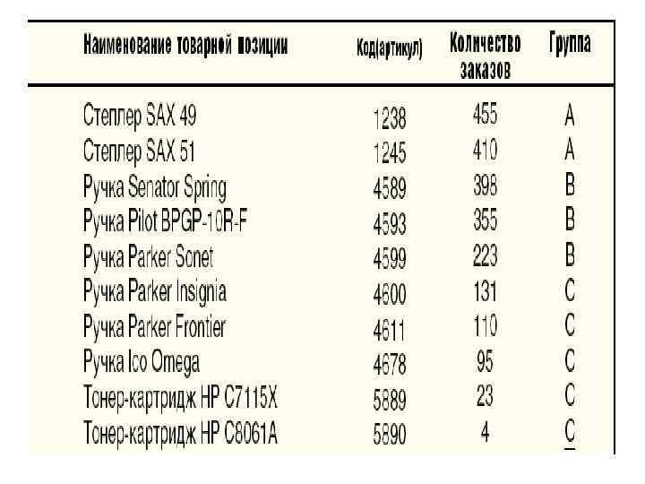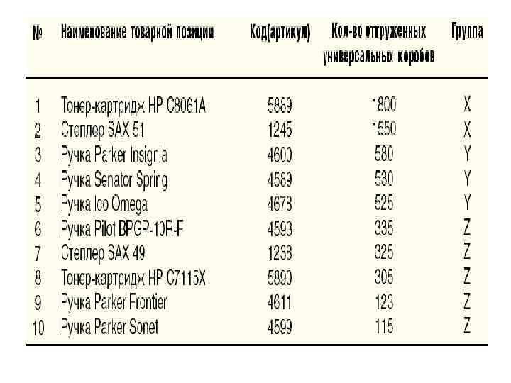 Информация должна содержать: наименование по каждой товарной позиции, количество заказов и количество отгруженных универсальных грузовых единиц помесячно по каждой товарной позиции. После составления статистической базы производится деление всего товарного ассортимента по АВС анализу на три группы. Деление производится в классических пропорциях: группа А (X) – 20 процентов, группа В (Y) – 30 процентов, группа С (Z) – 50 процентов. АВС анализ – количество заказов по каждой товарной позиции, XYZ – количество отгруженных грузовых единиц.