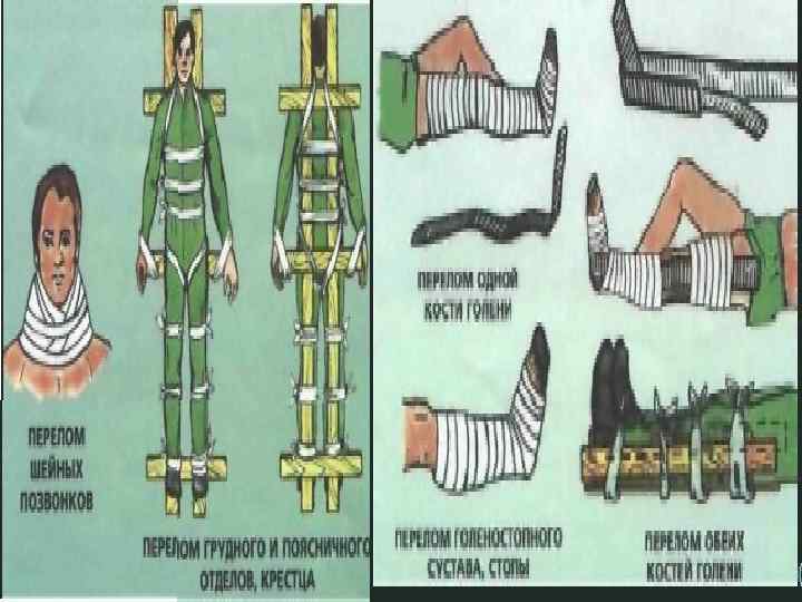* шина должна фиксировать не менее двух суставов, а при переломе бедра – все суставы нижней конечности, следствием ошибки является обычно смещение отломков во время транспортировки пациента. шину накладывают поверх одежды и обуви, которые при необходимости разрезают; перед наложением шины ее необходимо подогнать под размер поврежденной конечности. для предупрежд ен сдавливания тк ия ане в местах костны й х выступов накладывают мя гкий материал; шину нельзя накладывать с т ой стороны, где выступает сломанная кост ь. Концы пальцев, если они не повреждены, оставляют открытыми для контроля за кровообращени ем.