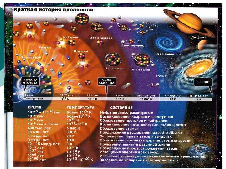 Космогония: концепция «Большого взрыва» 4. Происходило охлаждение. 5. Менялся состав материи. Вселенная оказалась заполненной элементарными частицами – протонами, нейтронами, электронами, нейтрино и фотонами. Реликтовое излучение – это как раз последствие аннигиляции (то есть взаимоуничтожения) частиц и античастиц. 6. Температура Вселенной упала до 1010 К (возраст Вселенной составлял примерно 1 минуту).