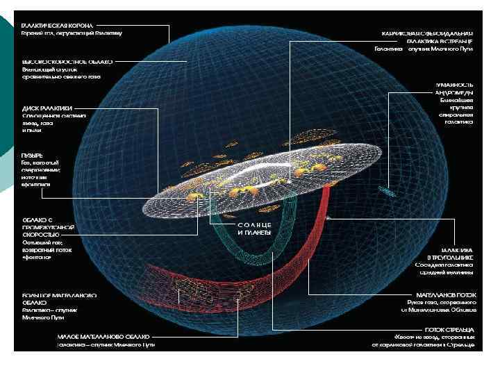 Космология и космогония. Галактика Млечный путь: ¡ Солнце находится от центра галактики на расстоянии 30 тыс. световых лет. ¡ Расстояние между ближайшими звездами в десятки миллионов раз превосходит их поперечники. ¡ Звезды, составляющие галактику, движутся вокруг ее центра со скоростью 220 км/сек. ¡ Солнечная система совершает оборот вокруг галактического центра за 250 миллионов лет.