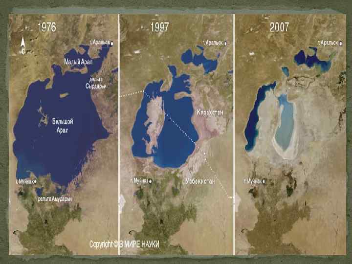 Проблема: Аральское море, принадлежавшее Казахстану и Узбекистану, было одним из самых больших континентальных водоемов в мире. Как море, так и реки, впадавшие в него (Аму и Сырдарья), обладали высокой экологической ценностью. Совсем немного осталось от этого богатства сегодня. Уровень воды снизился более чем на 20 метров, береговая линия отступила местами на 100 км. Прежняя акватория, 65. 000 кв. км - равная территории Голландии и Бельгии вместе взятых, сократилась на 70% и продолжает уменьшаться.