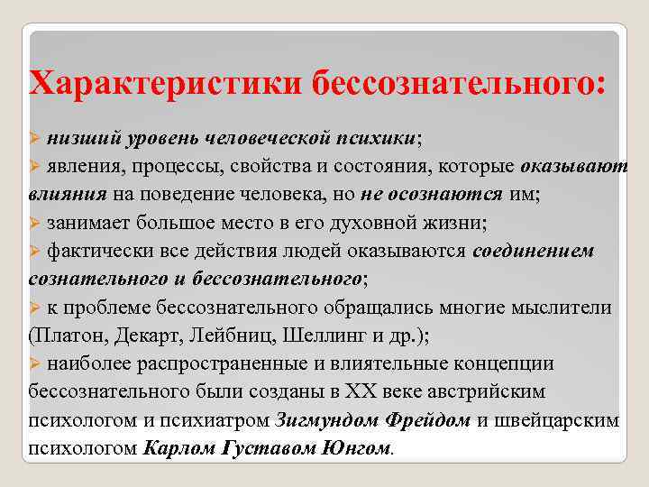 Характеристики бессознательного: Ø низший уровень человеческой психики; Ø явления, процессы, свойства и состояния, которые оказывают влияния на поведение человека, но не осознаются им; Ø занимает большое место в его духовной жизни; Ø фактически все действия людей оказываются соединением сознательного и бессознательного; Ø к проблеме бессознательного обращались многие мыслители (Платон, Декарт, Лейбниц, Шеллинг и др. ); Ø наиболее распространенные и влиятельные концепции бессознательного были созданы в ХХ веке австрийским психологом и психиатром Зигмундом Фрейдом и швейцарским психологом Карлом Густавом Юнгом.