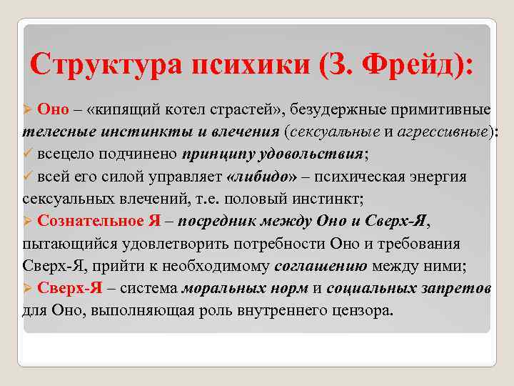 Структура психики (З. Фрейд): Ø Оно – «кипящий котел страстей» , безудержные примитивные телесные инстинкты и влечения (сексуальные и агрессивные): ü всецело подчинено принципу удовольствия; ü всей его силой управляет «либидо» – психическая энергия сексуальных влечений, т. е. половый инстинкт; Ø Сознательное Я – посредник между Оно и Сверх-Я, пытающийся удовлетворить потребности Оно и требования Сверх-Я, прийти к необходимому соглашению между ними; Ø Сверх-Я – система моральных норм и социальных запретов для Оно, выполняющая роль внутреннего цензора.