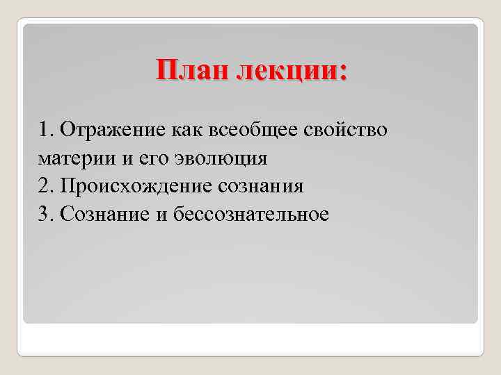 План лекции: 1. Отражение как всеобщее свойство материи и его эволюция 2. Происхождение сознания 3. Сознание и бессознательное