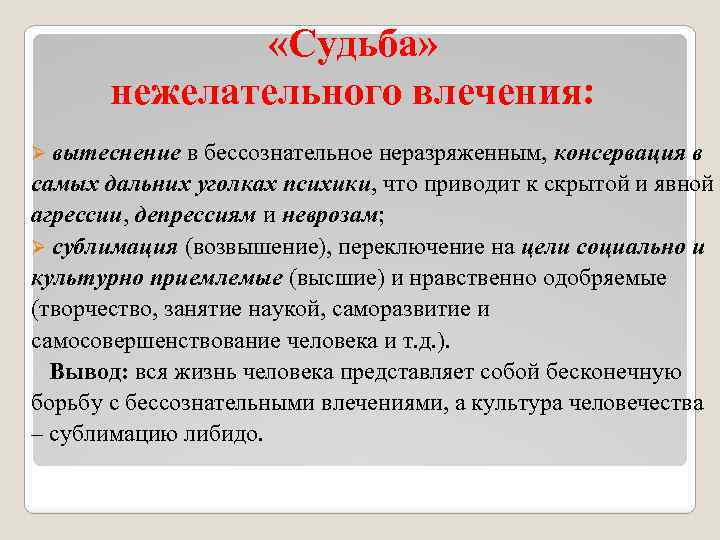 «Судьба» нежелательного влечения: Ø вытеснение в бессознательное неразряженным, консервация в самых дальних уголках психики, что приводит к скрытой и явной агрессии, депрессиям и неврозам; Ø сублимация (возвышение), переключение на цели социально и культурно приемлемые (высшие) и нравственно одобряемые (творчество, занятие наукой, саморазвитие и самосовершенствование человека и т. д. ). Вывод: вся жизнь человека представляет собой бесконечную борьбу с бессознательными влечениями, а культура человечества – сублимацию либидо.