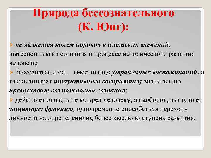 Природа бессознательного (К. Юнг): Ø не является полем пороков и плотских влечений, вытесненным из сознания в процессе исторического развития человека; Ø бессознательное – вместилище утраченных воспоминаний, а также аппарат интуитивного восприятия; значительно превосходит возможности сознания; Ø действует отнюдь не во вред человеку, а наоборот, выполняет защитную функцию, одновременно способствуя переходу личности на определенную, более высокую ступень развития.