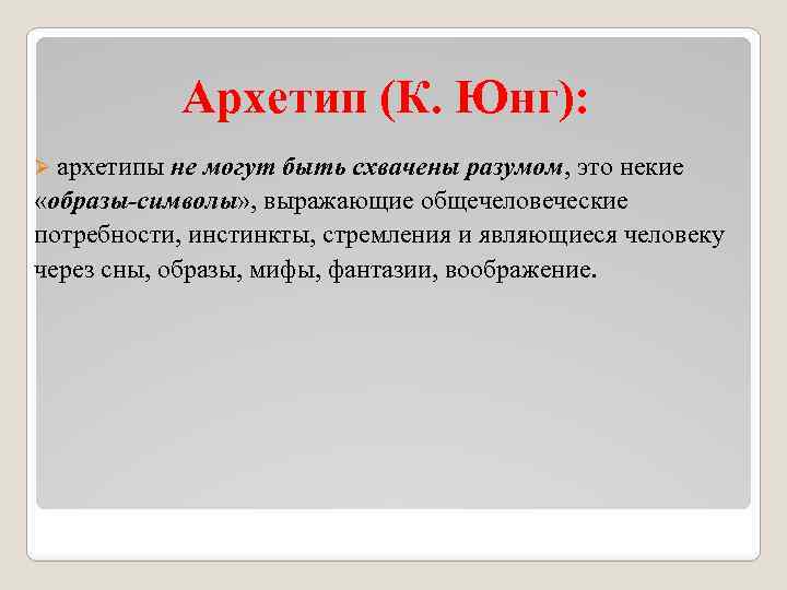 Архетип (К. Юнг): Ø архетипы не могут быть схвачены разумом, это некие «образы-символы» , выражающие общечеловеческие потребности, инстинкты, стремления и являющиеся человеку через сны, образы, мифы, фантазии, воображение.