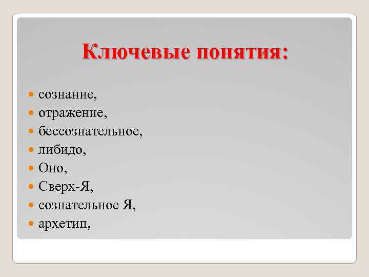 Ключевые понятия: сознание, отражение, бессознательное, либидо, Оно, Сверх-Я, сознательное Я, архетип,