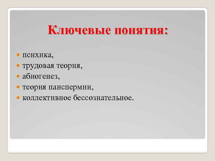 Ключевые понятия: психика, трудовая теория, абиогенез, теория панспермии, коллективное бессознательное.