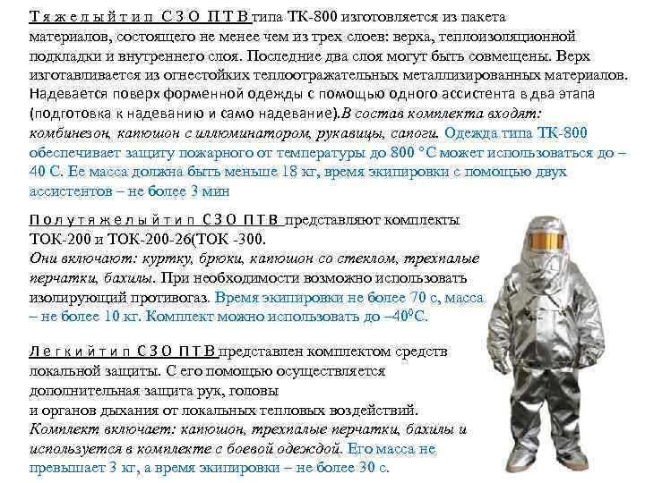 Т я ж е л ы й т и п С З О П Т В типа ТК-800 изготовляется из пакета материалов, состоящего не менее чем из трех слоев: верха, теплоизоляционной подкладки и внутреннего слоя. Последние два слоя могут быть совмещены. Верх изготавливается из огнестойких теплоотражательных металлизированных материалов. Надевается поверх форменной одежды с помощью одного ассистента в два этапа (подготовка к надеванию и само надевание). В состав комплекта входят: комбинезон, капюшон с иллюминатором, рукавицы, сапоги. Одежда типа ТК-800 обеспечивает защиту пожарного от температуры до 800 °С может использоваться до – 40 С. Ее масса должна быть меньше 18 кг, время экипировки с помощью двух ассистентов – не более 3 мин П о л у т я ж е л ы й т и п С З О П Т В представляют комплекты ТОК-200 и ТОК-200 -26(ТОК -300. Они включают: куртку, брюки, капюшон со стеклом, трехпалые перчатки, бахилы. При необходимости возможно использовать изолирующий противогаз. Время экипировки не более 70 с, масса – не более 10 кг. Комплект можно использовать до – 400 С. Л е г к и й т и п С З О П Т В представлен комплектом средств локальной защиты. С его помощью осуществляется дополнительная защита рук, головы и органов дыхания от локальных тепловых воздействий. Комплект включает: капюшон, трехпалые перчатки, бахилы и используется в комплекте с боевой одеждой. Его масса не превышает 3 кг, а время экипировки – не более 30 с.
