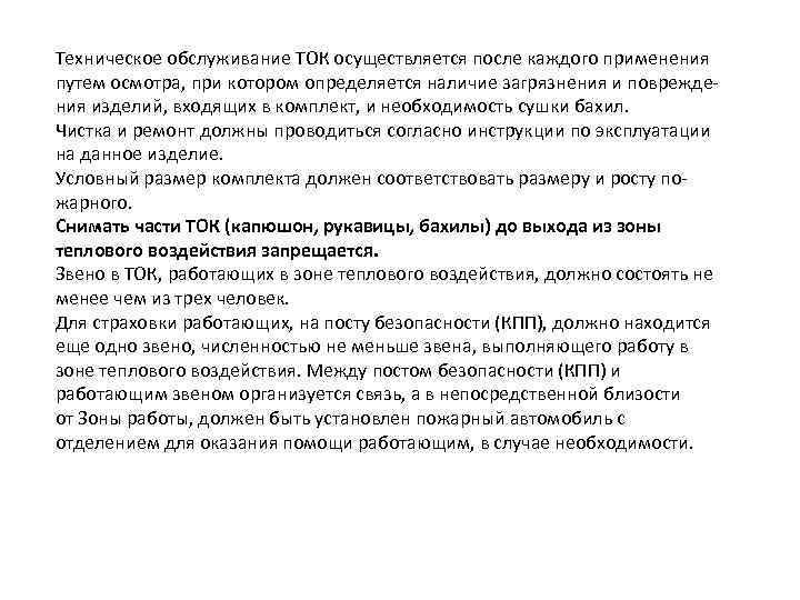 Техническое обслуживание ТОК осуществляется после каждого применения путем осмотра, при котором определяется наличие загрязнения и повреждения изделий, входящих в комплект, и необходимость сушки бахил. Чистка и ремонт должны проводиться согласно инструкции по эксплуатации на данное изделие. Условный размер комплекта должен соответствовать размеру и росту пожарного. Снимать части ТОК (капюшон, рукавицы, бахилы) до выхода из зоны теплового воздействия запрещается. Звено в ТОК, работающих в зоне теплового воздействия, должно состоять не менее чем из трех человек. Для страховки работающих, на посту безопасности (КПП), должно находится еще одно звено, численностью не меньше звена, выполняющего работу в зоне теплового воздействия. Между постом безопасности (КПП) и работающим звеном организуется связь, а в непосредственной близости от Зоны работы, должен быть установлен пожарный автомобиль с отделением для оказания помощи работающим, в случае необходимости.