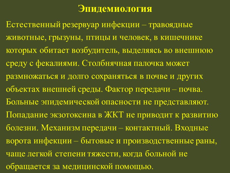Эпидемиология Естественный резервуар инфекции – травоядные животные, грызуны, птицы и человек, в кишечнике которых обитает возбудитель, выделяясь во внешнюю среду с фекалиями. Столбнячная палочка может размножаться и долго сохраняться в почве и других объектах внешней среды. Фактор передачи – почва. Больные эпидемической опасности не представляют. Попадание экзотоксина в ЖКТ не приводит к развитию болезни. Механизм передачи – контактный. Входные ворота инфекции – бытовые и производственные раны, чаще легкой степени тяжести, когда больной не обращается за медицинской помощью.