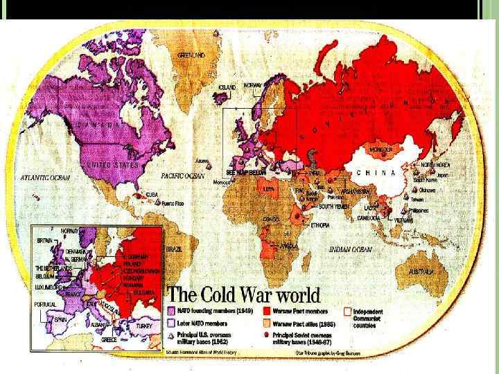 ХОЛОДНАЯ ВОЙНА глобальная геополитическая, экономическая и идеологическая конфронтация между Советским Союзом и его союзниками, с одной стороны, и США и их союзниками — с другой, длившаяся с середины 1940 -х до начала 1990 -х годов. США и СССР создали свои сферы влияния, закрепив их военно-политическими блоками — НАТО и ОВД. Хотя Соединённые Штаты и СССР никогда не вступали в прямое военное противостояние, их соперничество за влияние часто приводило к вспышкам локальных вооружённых конфликтов по всему миру. Холодная война сопровождалась гонкой обычных и ядерных вооружений, то и дело угрожавшей привести к третьей мировой войне.