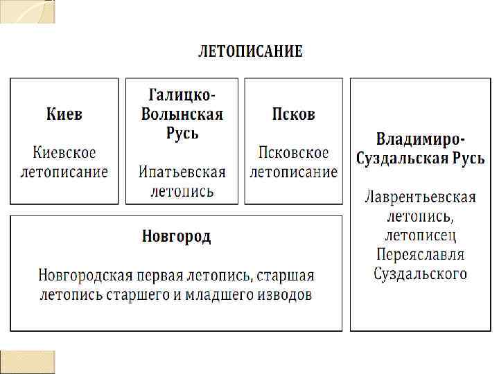 Владимиро- Суздальская Русь «Лаврентьевская летопись» «Летописец Переяславля Суздальского» «Повесть временных лет» Галицко – Волынская Русь «Ипатьевская летопись» Новгород «Новгородская первая летопись старшего и младшего изводов» Псковское летописание Киевское летописание