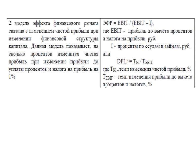 ЭФР через показатель «Прибыль на акцию» EPS Акционерное общество может привлечь капитал через выпуск ценных бумаг EPS = Чистая прибыль / количество акций Чистая прибыль = (EBIT — I)*(1 -T) — Dp Показатель рассчитывается для разных способов финансирования (кредит, облигации, доп. выпуск привелигированных или обыкновенных акций) и выявляют мах EPS